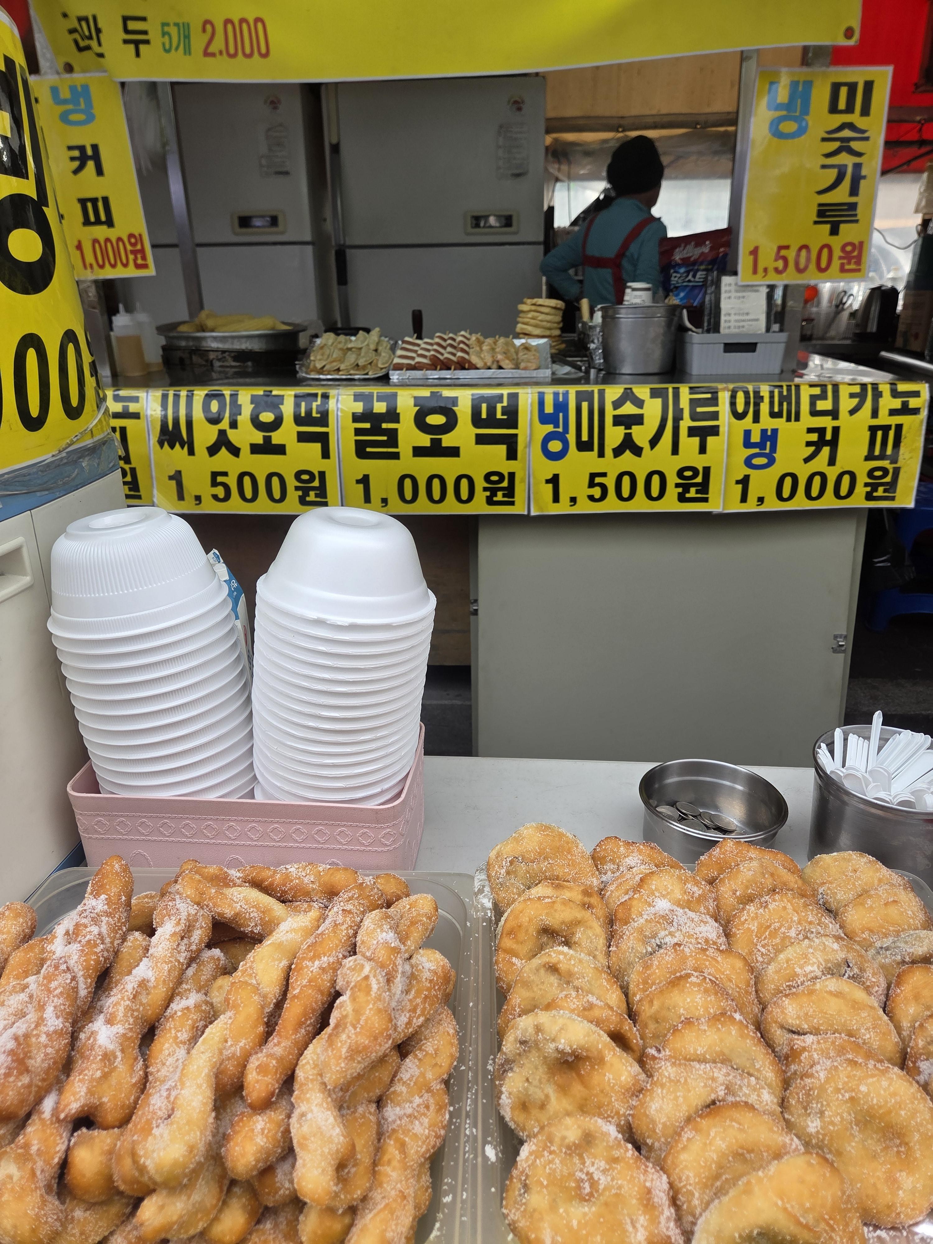 갓 튀겨낸 도너츠의 달콤하고 고소한 냄새가 시장 골목을 가득 채워 발걸음을 멈추게 해요.