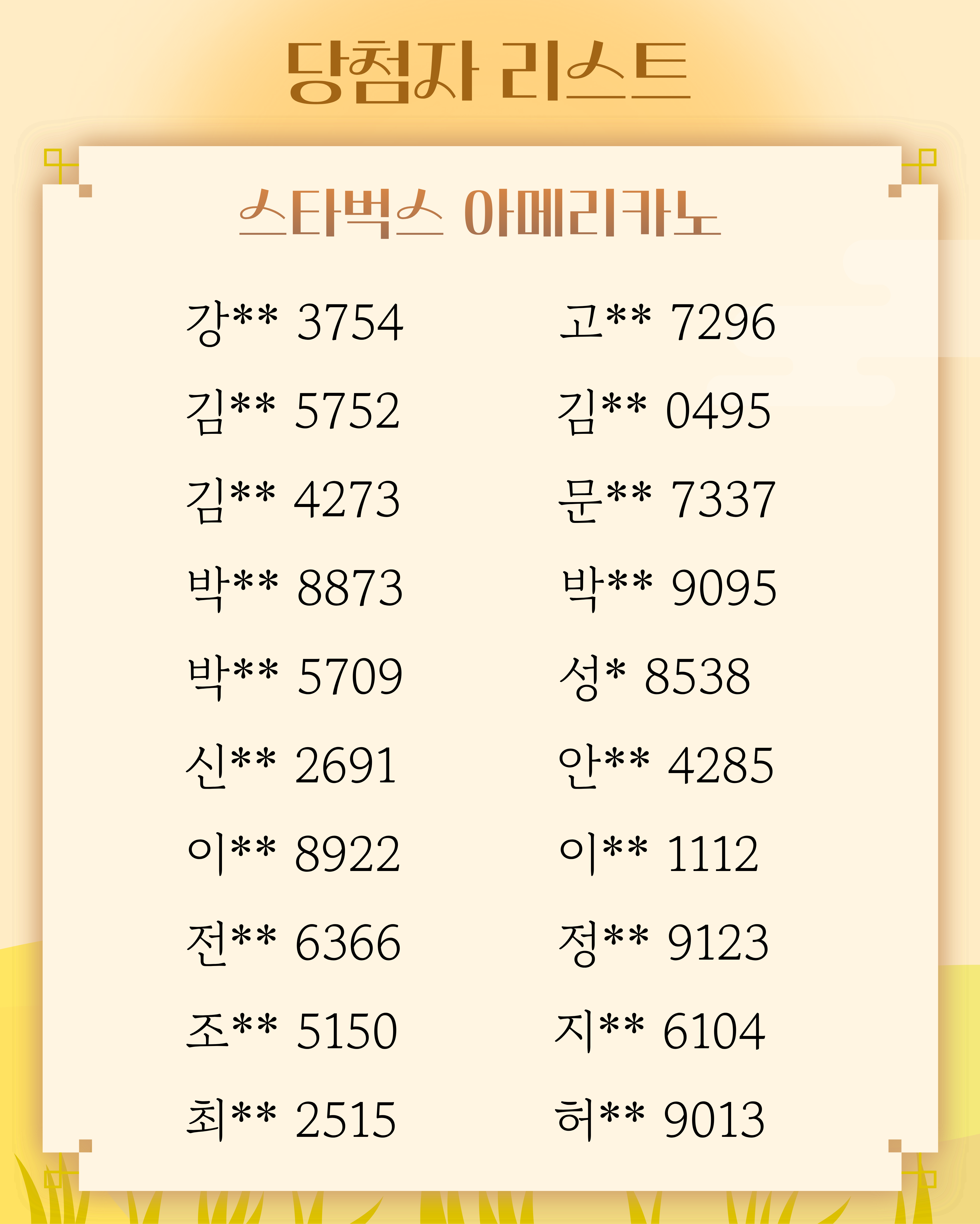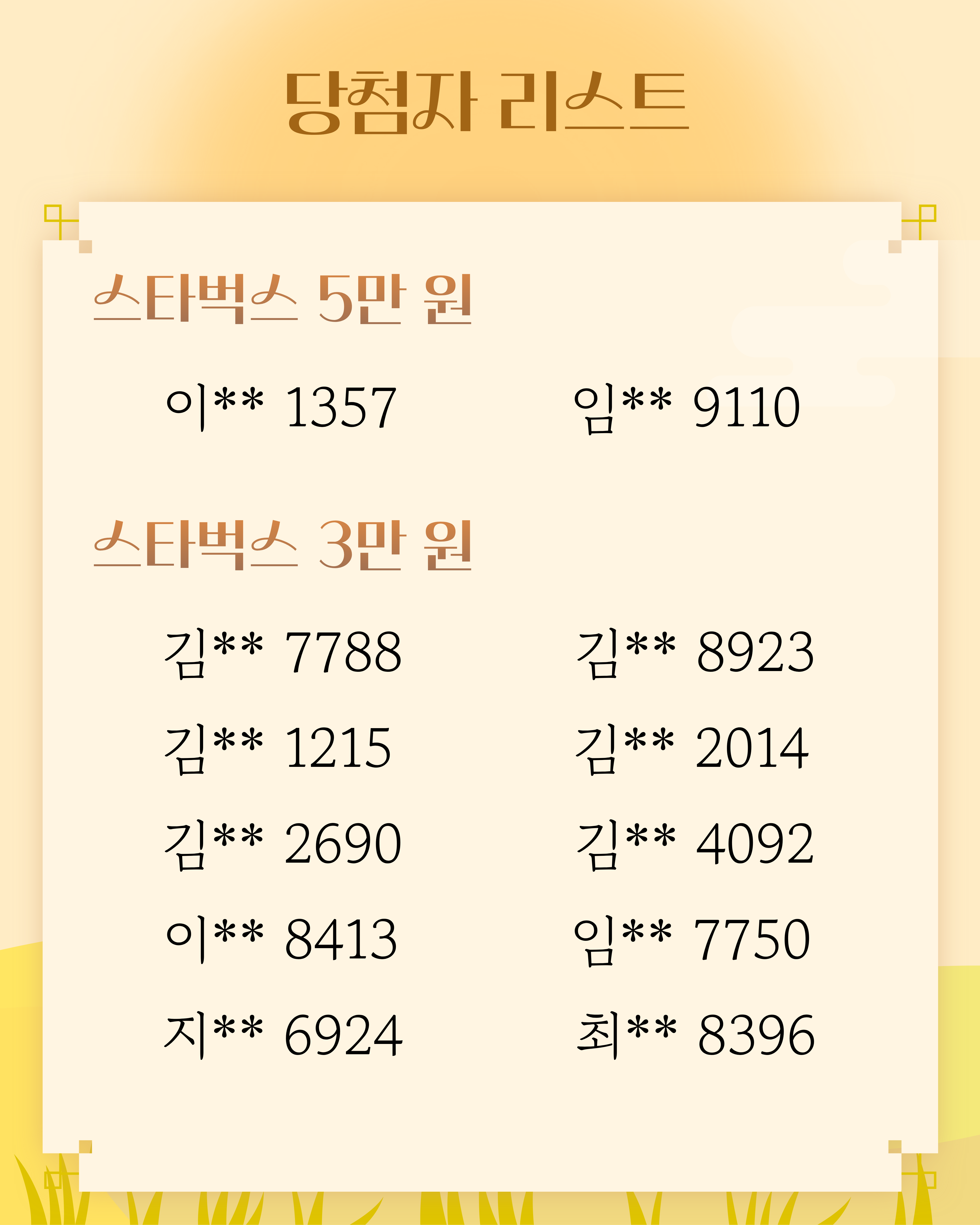 ● 당첨자 명단 번호는 핸드폰 번호 뒤 4자리입니다.