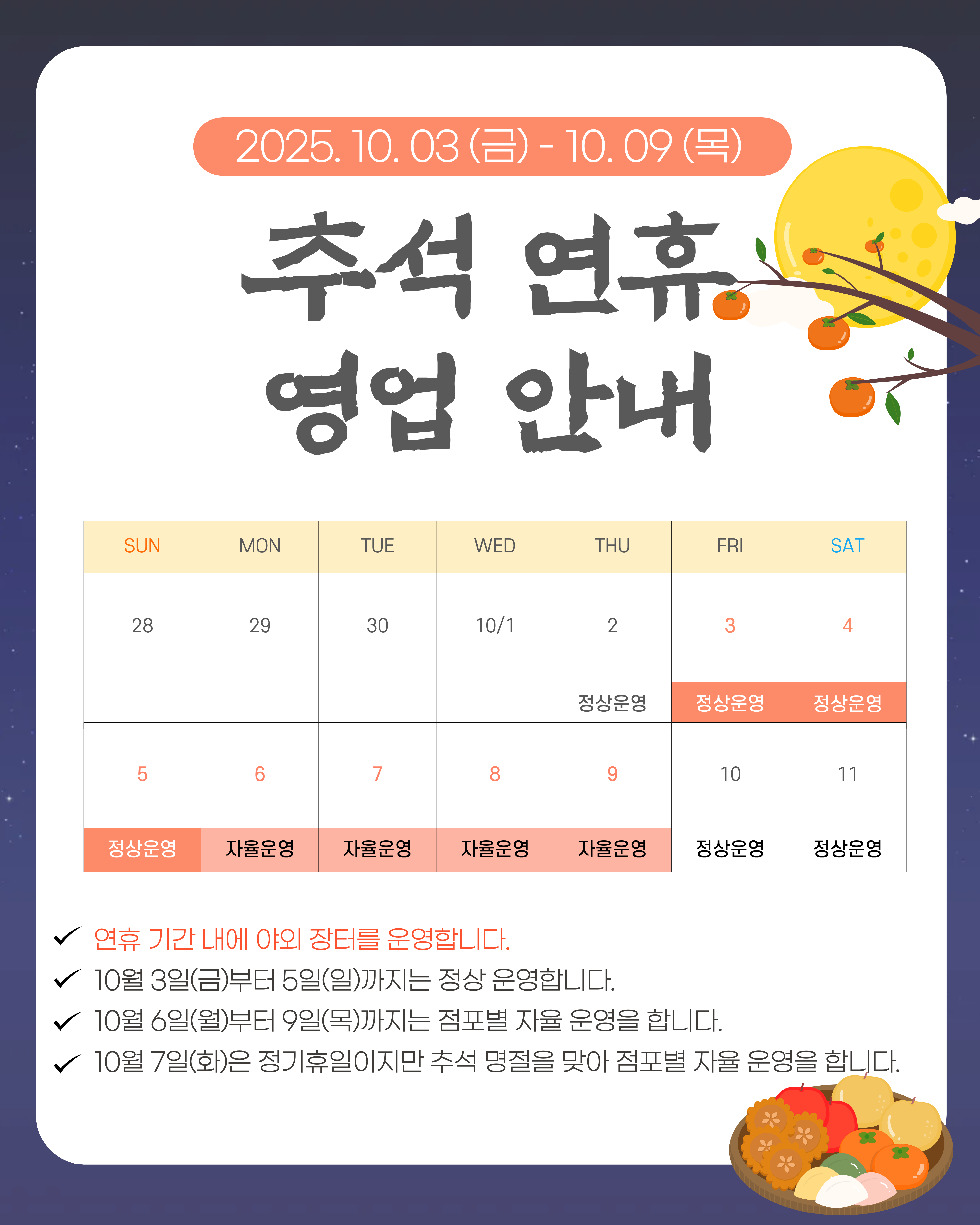 ※10월 7일(화)은 화요일로 정기 휴장일이지만, 추석 명절을 맞이하여 점포별 자율 운영을 합니다.
